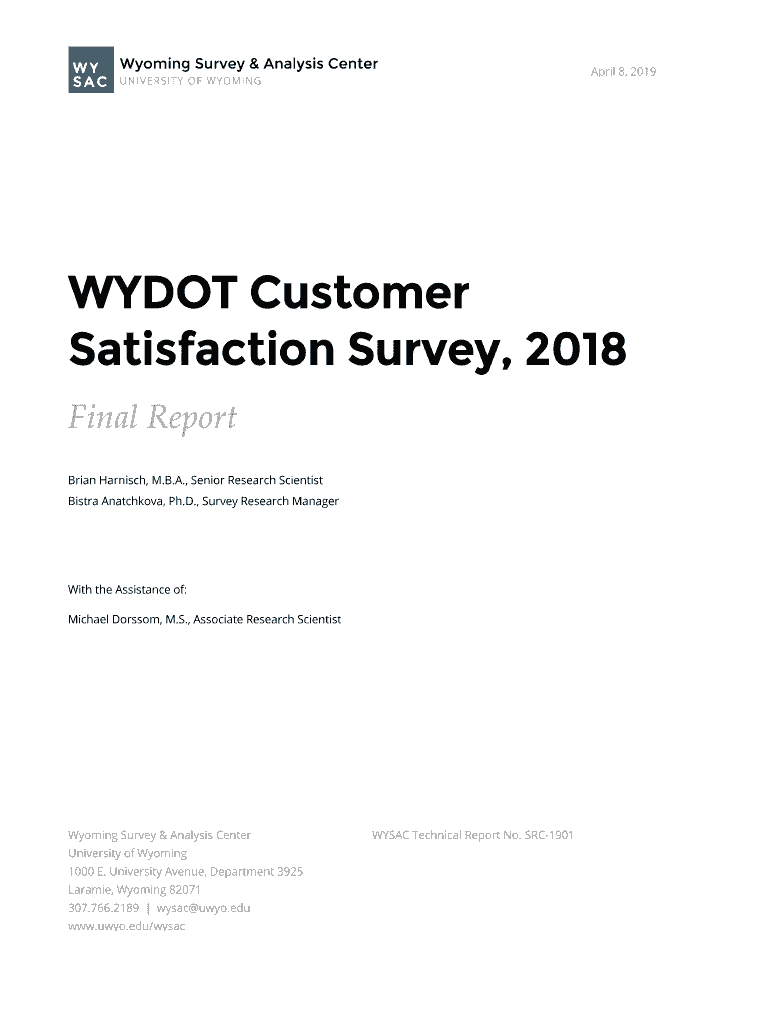April 8, 2019WYDOT Customer Satisfaction Survey, 2018 Final Report Brian Heinrich, M.B.A., Senior Research Scientist Bistro Anatchkova, Ph.D., Survey Research Managerial the Assistance of: Michael