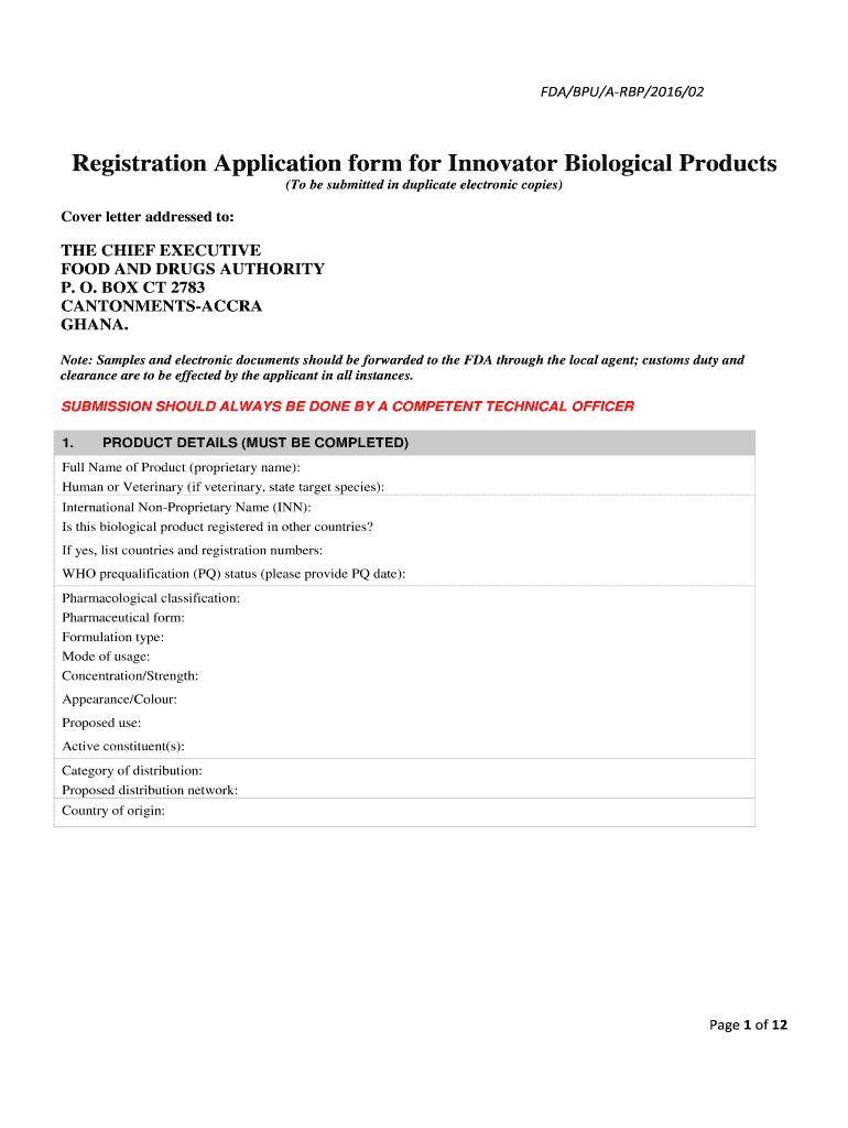 FDA/BPU/ARP/2016/02Registration Application form for Innovator Biological Products