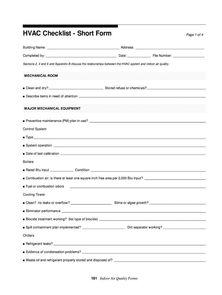 HVAC Checklist Short Form Page 1 of 4Building Name: Address: Completed by: Date: File Number: Sections 2, 4 and 6 and Appendix B discuss the relationships between the HVAC system and indoor air quality.
