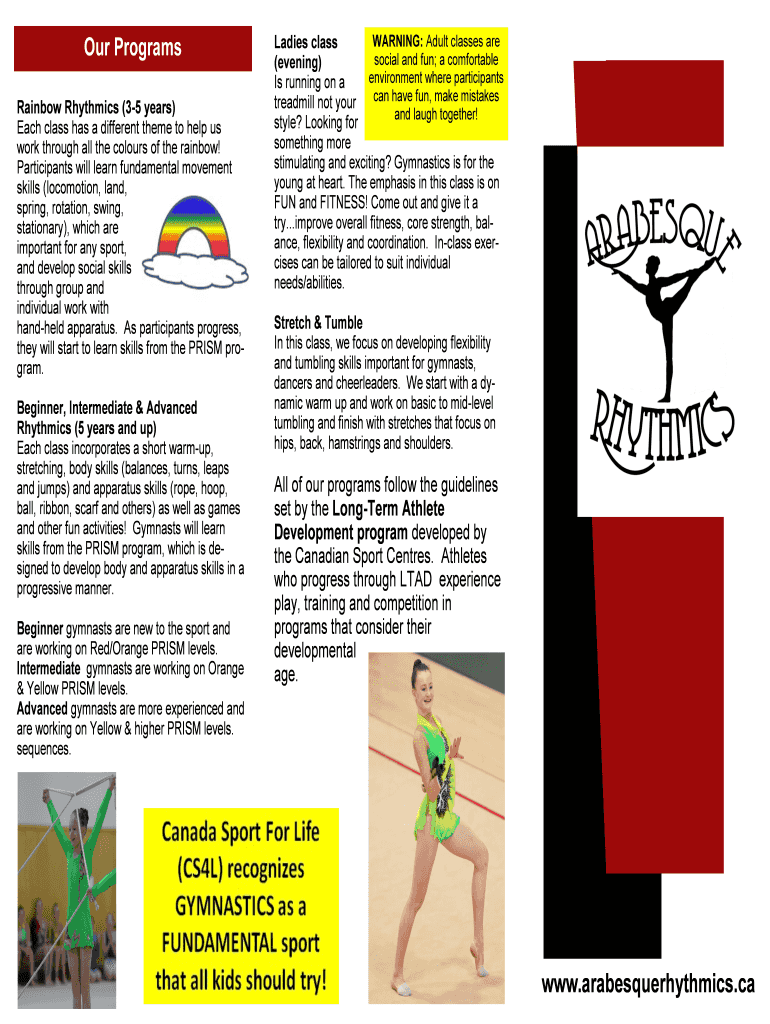 Our Programs Rainbow Rhythmic (35 years) Each class has a different theme to help us work through all the colors of the rainbow! Participants will learn fundamental movement skills (locomotion, land,