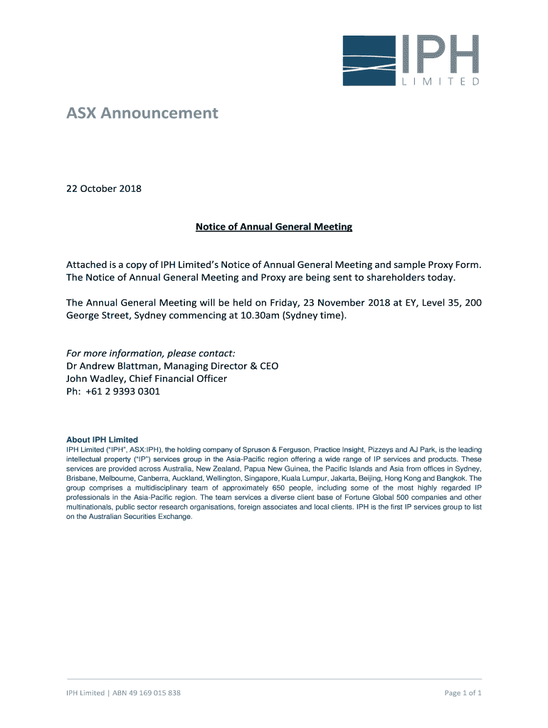 ASX Announcement22 October 2018Notice of Annual General MeetingAttached is a copy of MPH Limited Notice of Annual General Meeting and sample Proxy Form. The Notice of Annual General Meeting and Proxy