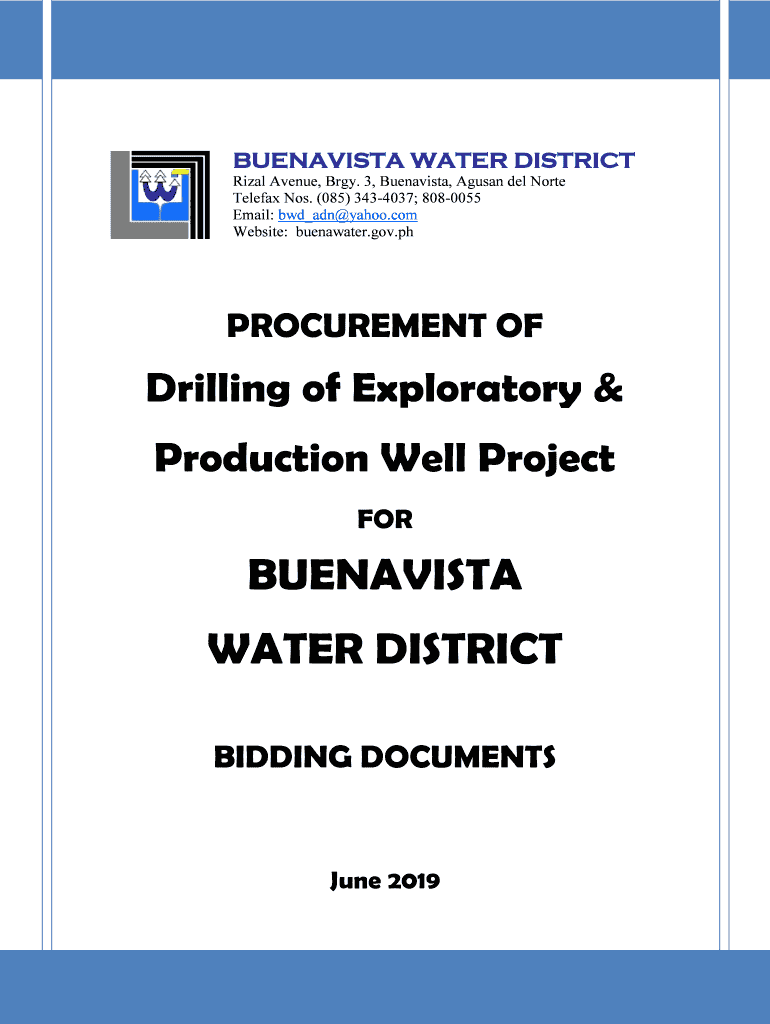 BUENAVISTA WATER DISTRICT Rizal Avenue, Bray. 3, Buenavista, Susan del North Telefax Nos. (085) 3434037; 8080055 Email: BWD ADN yahoo.com Website: seawater.gov.procurement Drilling of Exploratory