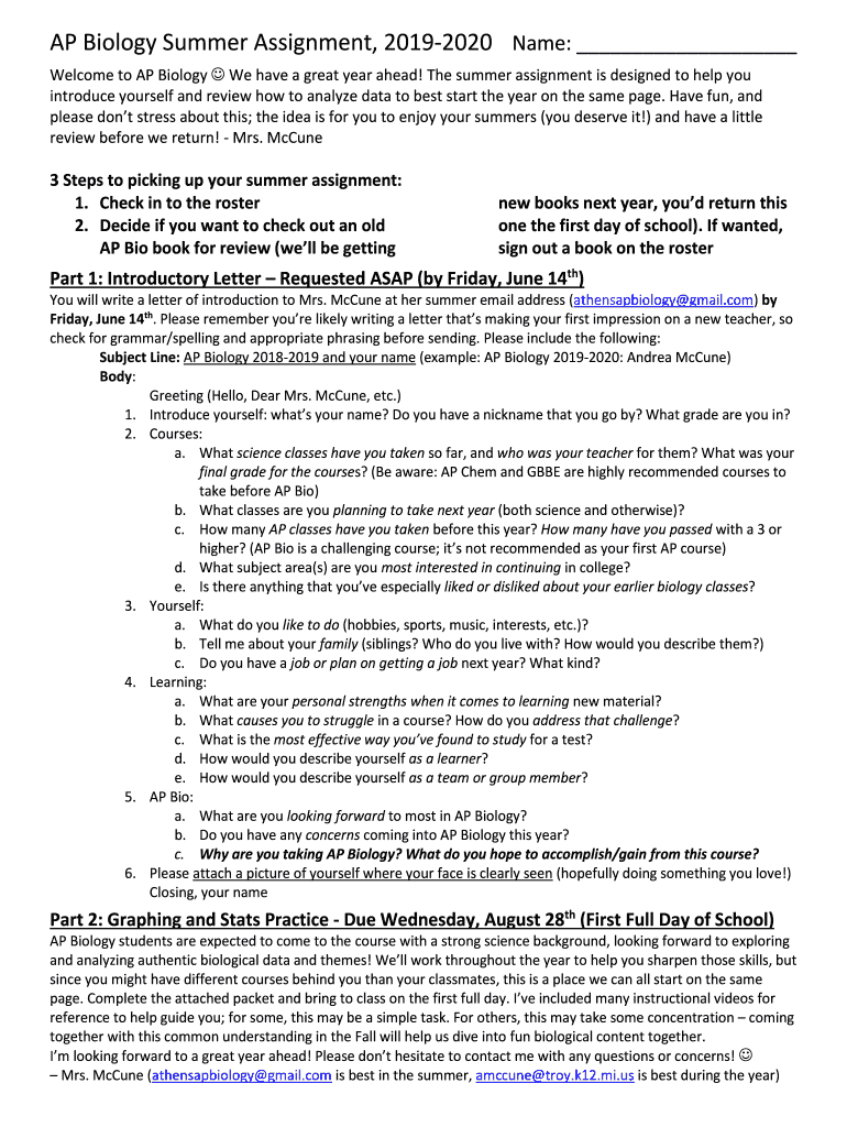 AP Biology Summer Assignment, 20192020 Names: Welcome to AP Biology We have a great year ahead! The summer assignment is designed to help you introduce yourself and review how to analyze data to the