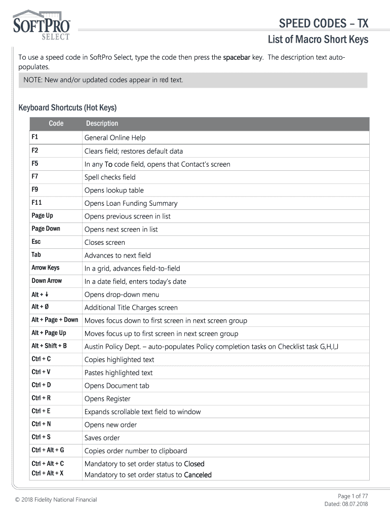 SPEED CODES TX List of Macro Short Keys To use a speed code in Softer Select, type the code then press the space bar key. The description text autopopulates. NOTE: New and/or updated codes appear