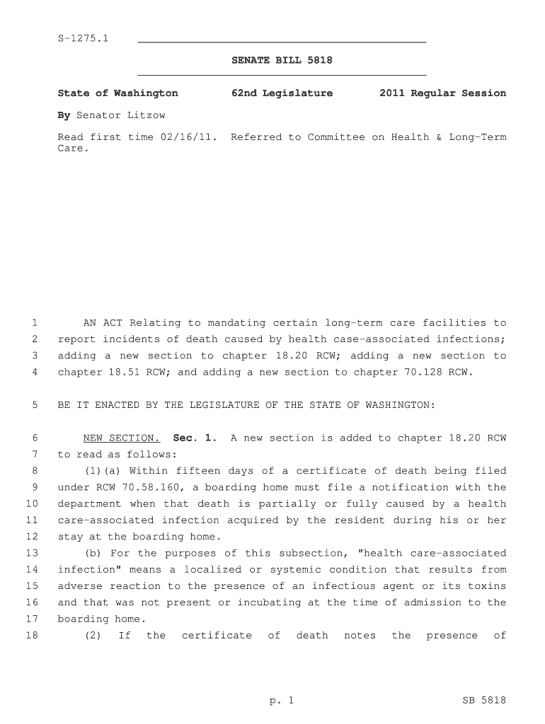 S1275.1 SENATE BILL 5818 State of Washington62nd Legislature2011 Regular Session Senator Litton Read first time 02/16/11. Care. Referred to Committee on Health & LongTerm1 2 3 4AN ACT Relating to