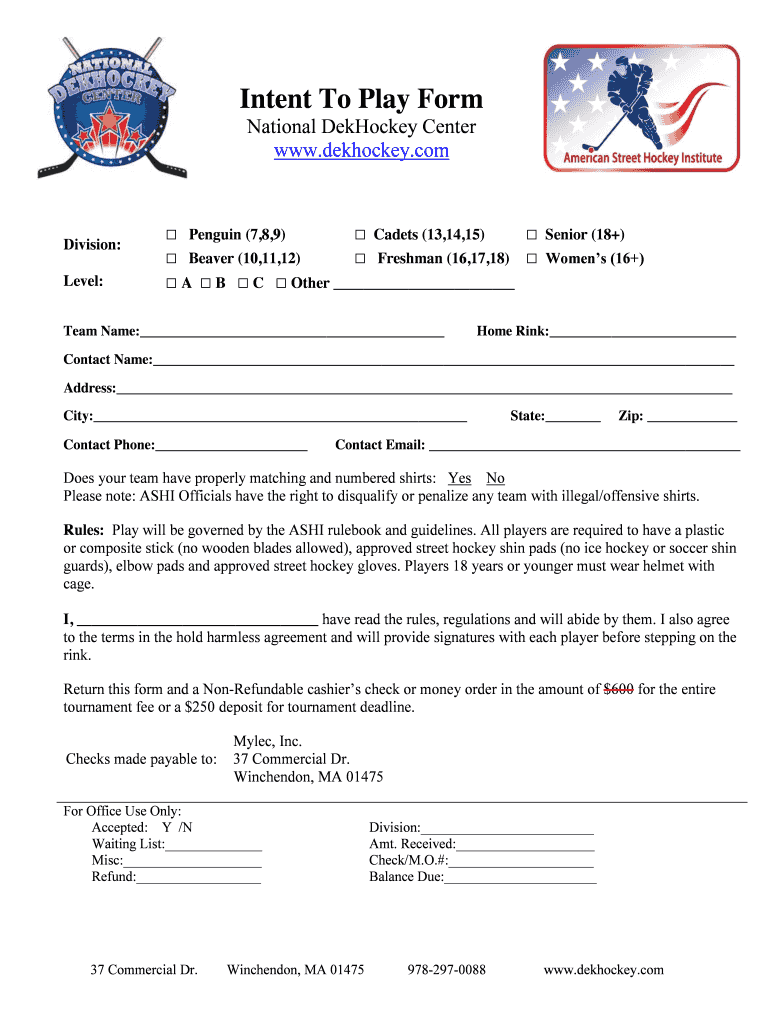 Intent To Play Form National Hockey Center www.dekhockey.comDivision: Level: Penguin (7,8,9) Cadets (13,14,15) Beaver (10,11,12) Freshman (16,17,18) A B C Other Team Name: Senior (18+) Women's (16+)Home