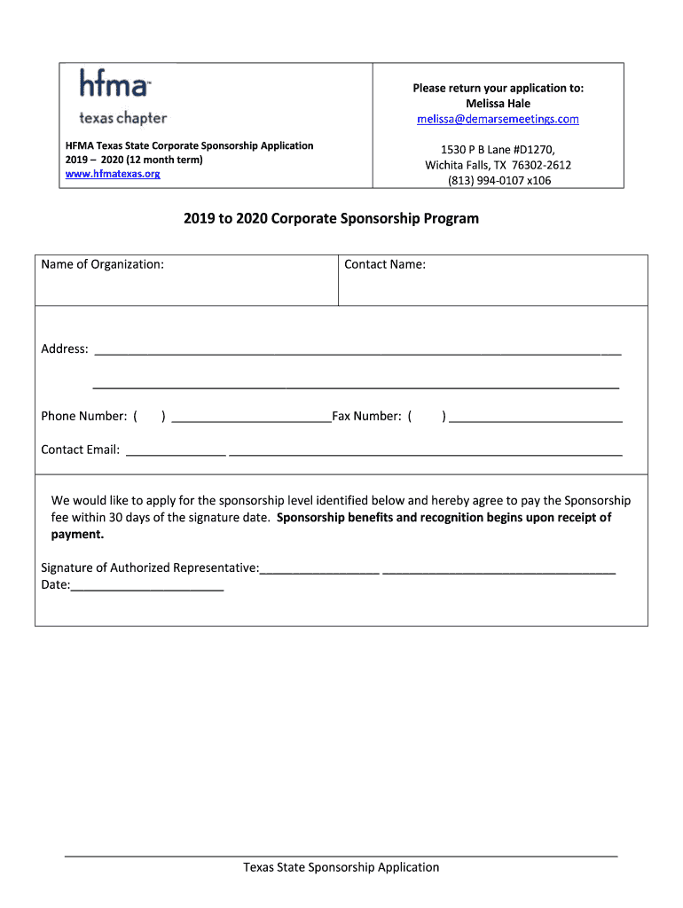 Please return your application to: Melissa Hale Melissa demarsemeetings.com FMA Texas State Corporate Sponsorship Application 2019 2020 (12-month term) www.hfmatexas.org1530 P B Lane #D1270, Wichita