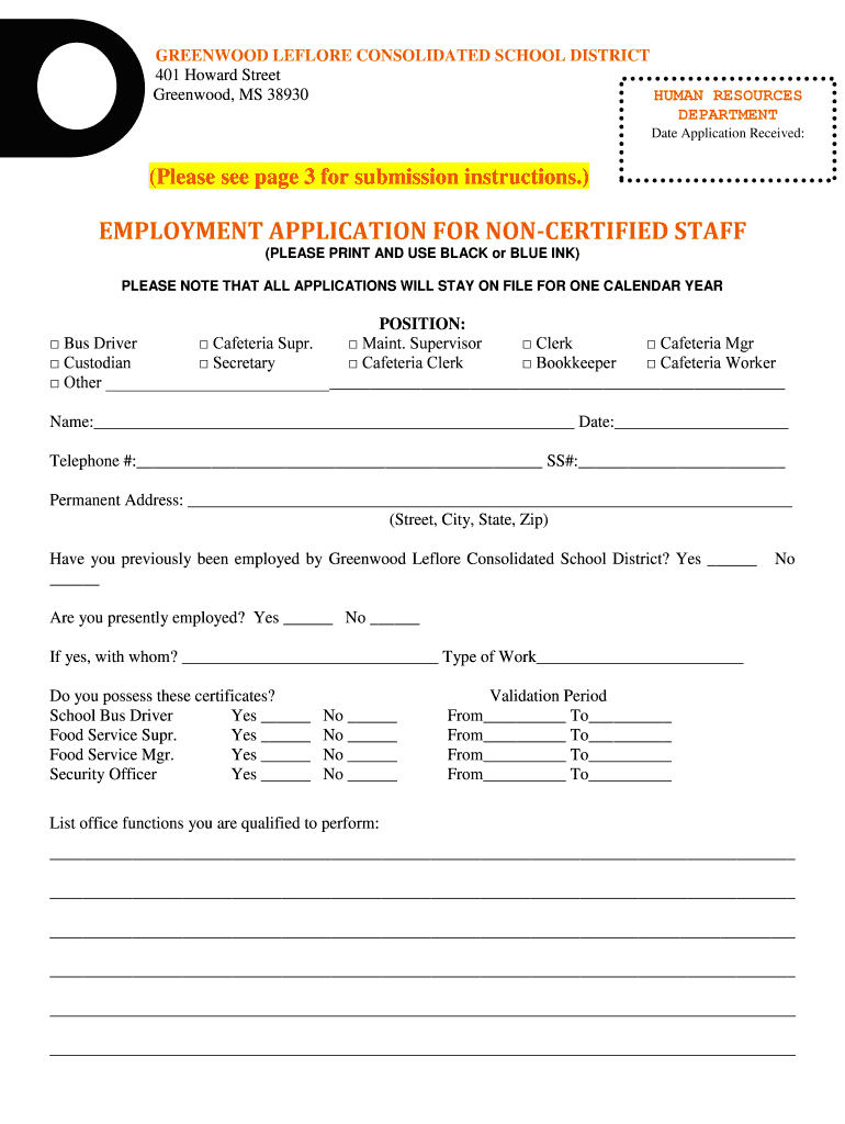 GREENWOOD BEFORE CONSOLIDATED SCHOOL DISTRICT 401 Howard Street Greenwood, MS 38930 HUMAN RESOURCES DEPARTMENT Date Application Received:(Please see page 3 for submission instructions.)EMPLOYMENT