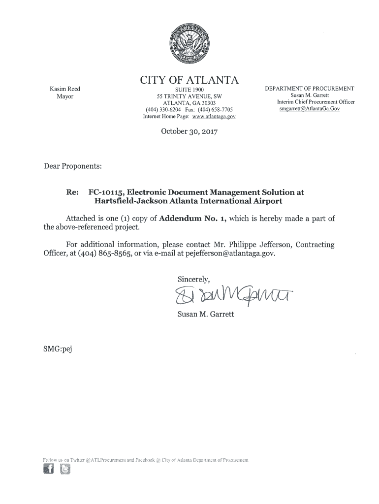 Addendum No. 1 Re: FC10115, Electronic Document Management Solution at Hartsfield-Jackson Atlanta International Airport October 30, 2017-Page 2 This Addendum forms a part of the Request for Proposal