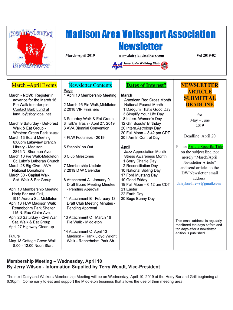 Madison Area Volkssport Association Newsletter March April 2019March April Events March NOW: Register in advance for the March 16 Pie Walk to order pie: Contact Barb Land at land b global.net March