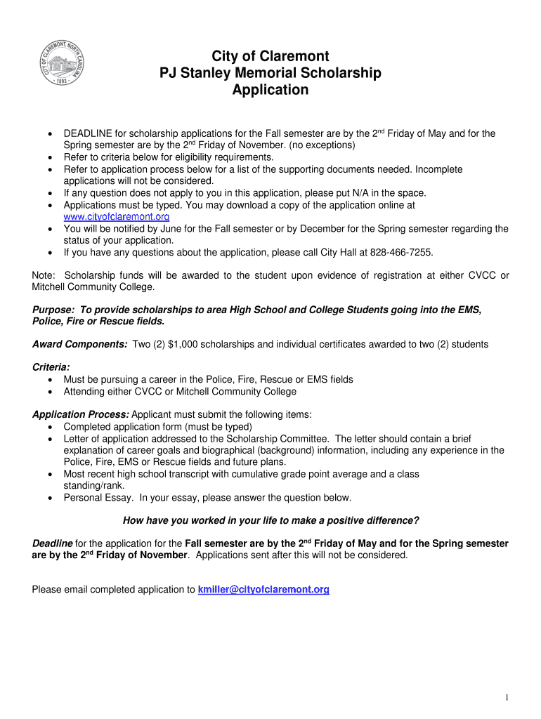 City of Claremont PJ Stanley Memorial Scholarship Application DEADLINE for scholarship applications for the Fall semester are by the 2nd Friday of May and for the Spring semester are by the 2nd Friday