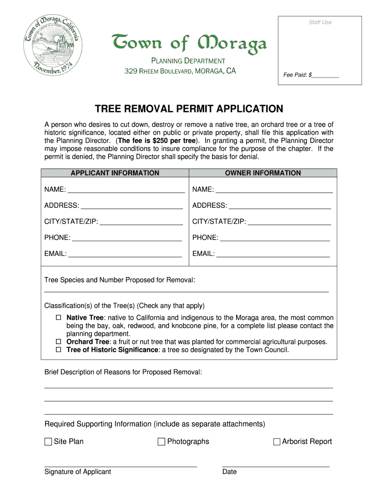 Staff Preplanning DEPARTMENT 329 RHEE BOULEVARD, MORAL, Café Paid: $ TREE REMOVAL PERMIT APPLICATION A person who desires to cut down, destroy or remove a native tree, an orchard tree or a tree of