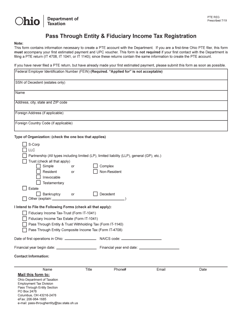 PTE REG Prescribed 7/19Pass Through Entity & Fiduciary Income Tax Registration Note: This form contains information necessary to create a PTE account with the Department. If you are a first time Ohio