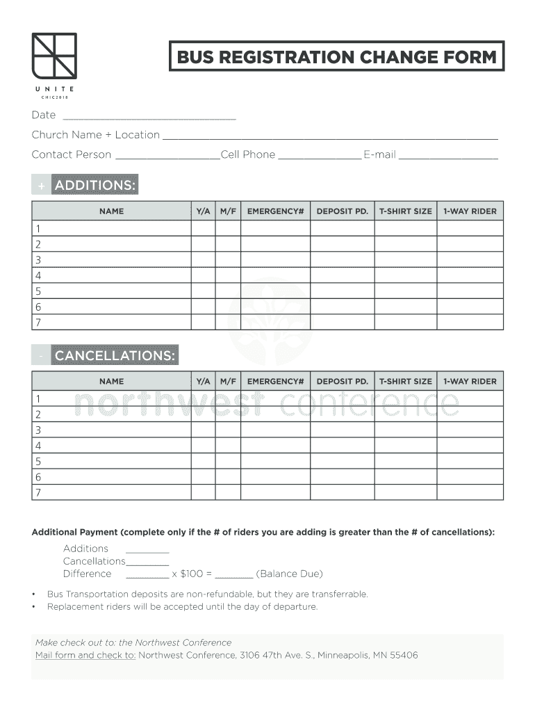 BUS REGISTRATION CHANGE FORM U N I T E CHIC2018Date Church Name + Location Contact Person Cell Phone Email + ADDITIONS: NAME/AM/EMERGENCY×DEPOSIT PD.SHIRT SIZE1WAY RIDER/AM/EMERGENCY×DEPOSIT PD.SHIRT