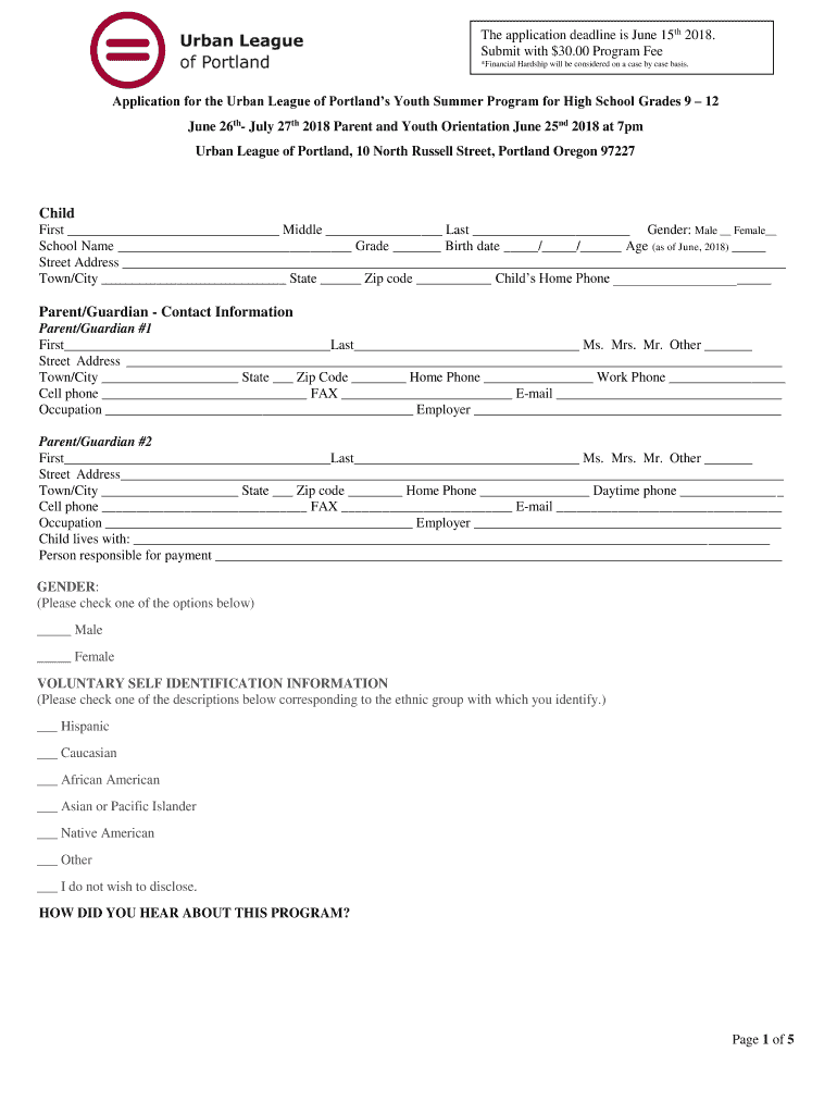 The application deadline is June 15th 2018. Submit with $30.00 Program Fee *Financial Hardship will be considered on a case by case basis. Application for the Urban League of Portland's Youth Summer