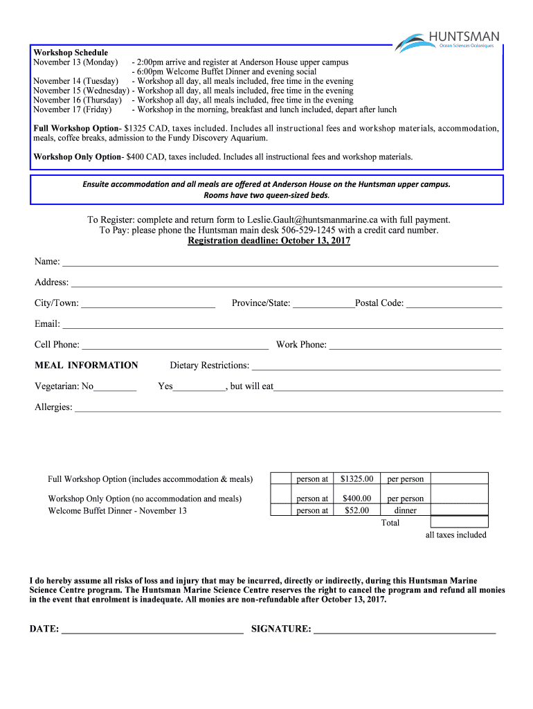 Workshop Schedule November 13 (Monday) 2:00pm arrive and register at Anderson House upper campus 6:00pm Welcome Buffet Dinner and evening social November 14 (Tuesday) Workshop all day, all meals included,