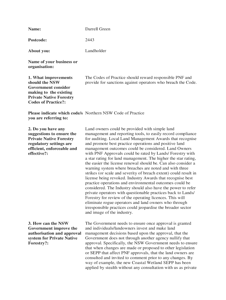 Name:Darrell GreenPostcode:2443About you:LandholderName of your business or