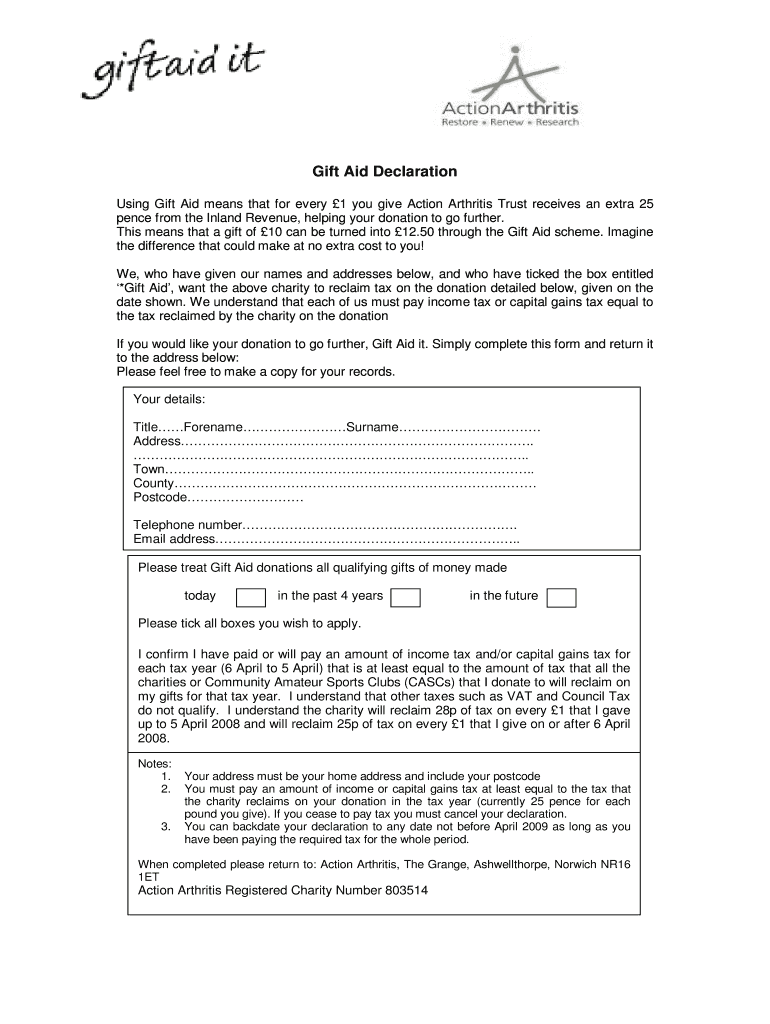Get the free Using Gift Aid means that for every 1 you give Action Arthritis Trust receives an ex...