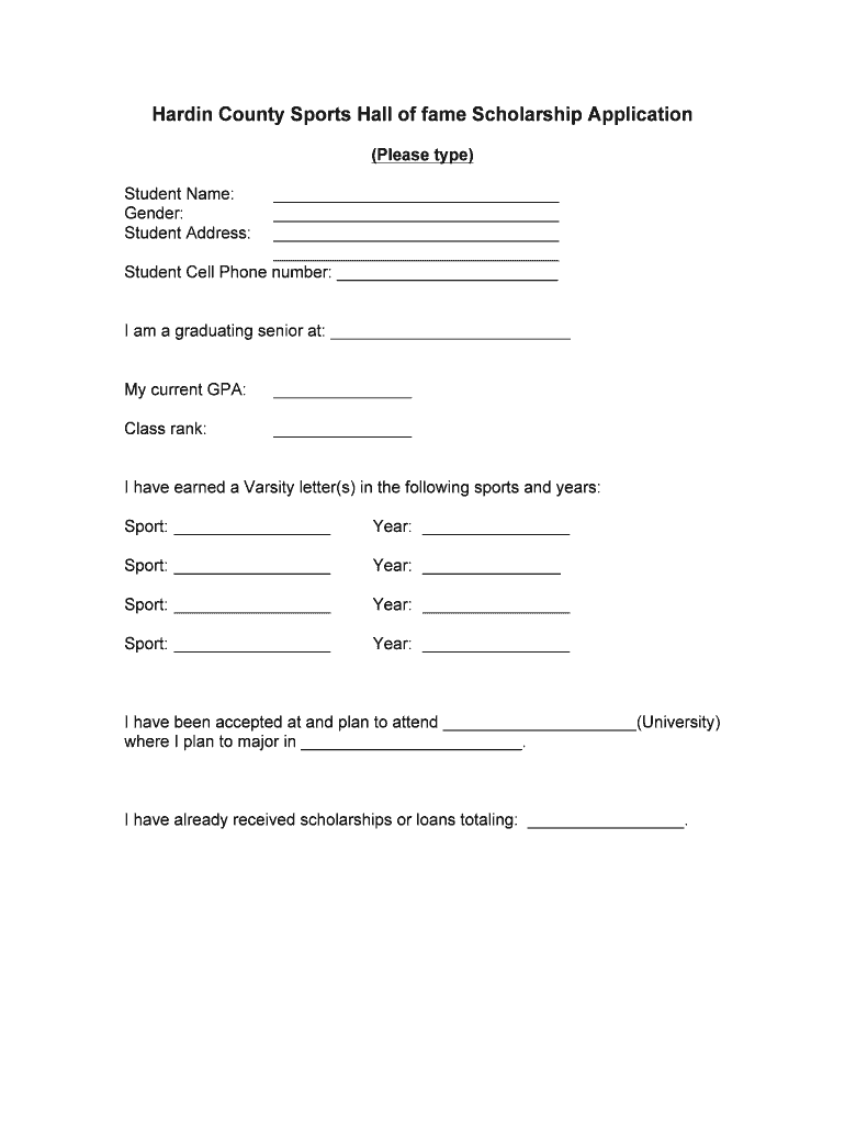 Honoring a legacy of athletic excellence Hardin County Sports Hall of Fame Scholarship Application Form The Hardin County Sports Hall of Fame Committee will make recipient selection. The administrative