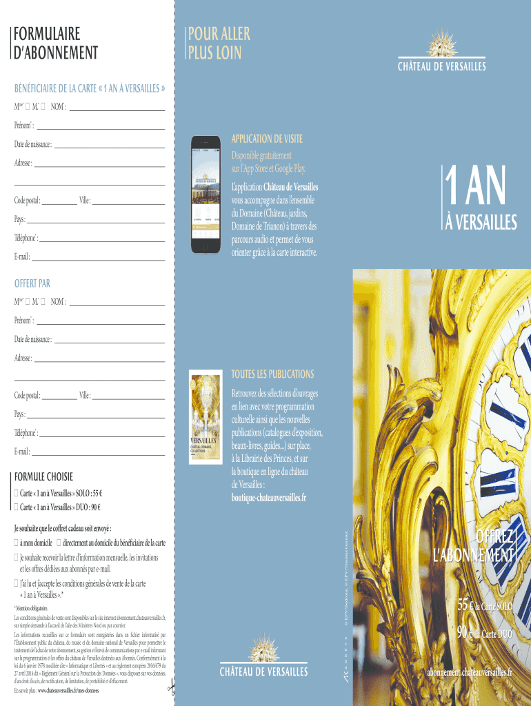 Formulae DABONNEMENTPOUr Allen PLUS LOINbnficiaire de la care 1 a Versailles Mme’M.×NOT* : Prom* : Date de Renaissance : Address : Code postal : Villa : Pays : Tl phone* : Email : application DE