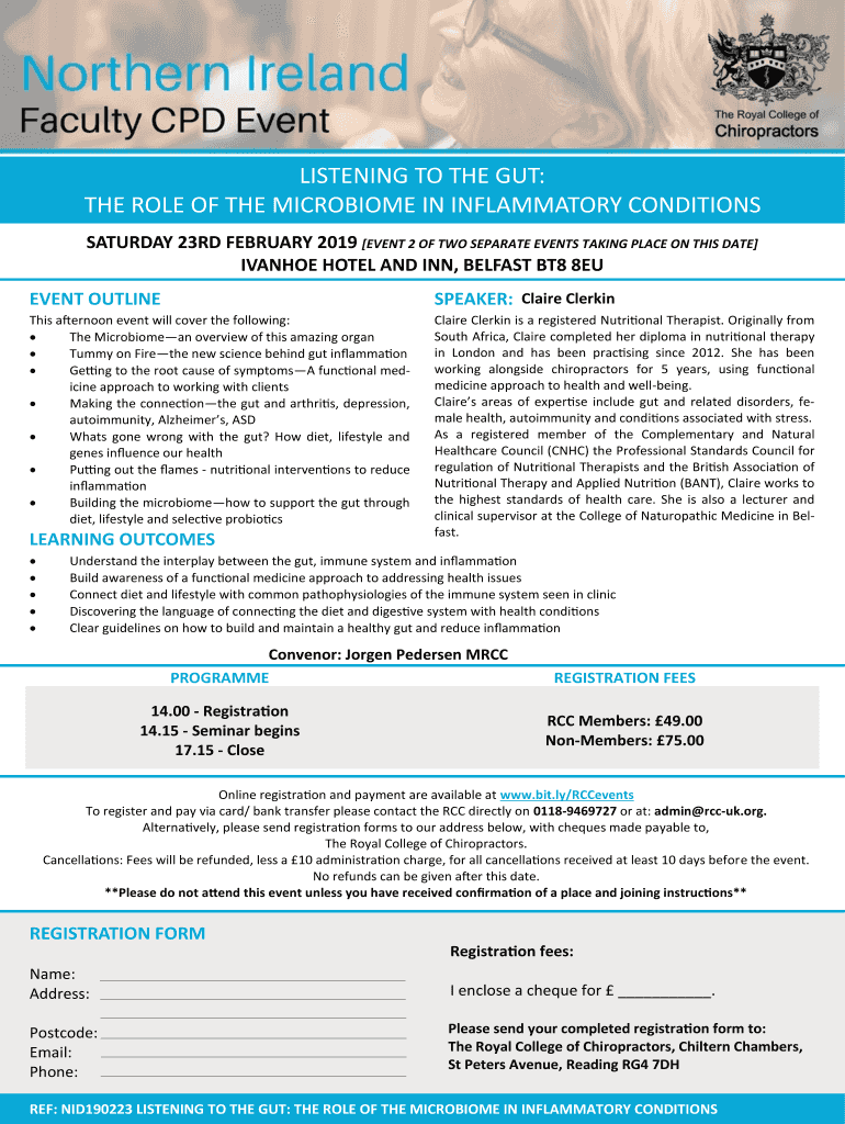 LISTENING TO THE GUT: THE ROLE OF THE MICROBIOME IN INFLAMMATORY CONDITIONS SATURDAY 23RD FEBRUARY 2019 EVENT 2 OF TWO SEPARATE EVENTS TAKING PLACE ON THIS DATE IVANHOE HOTEL AND INN, BELFAST BT8