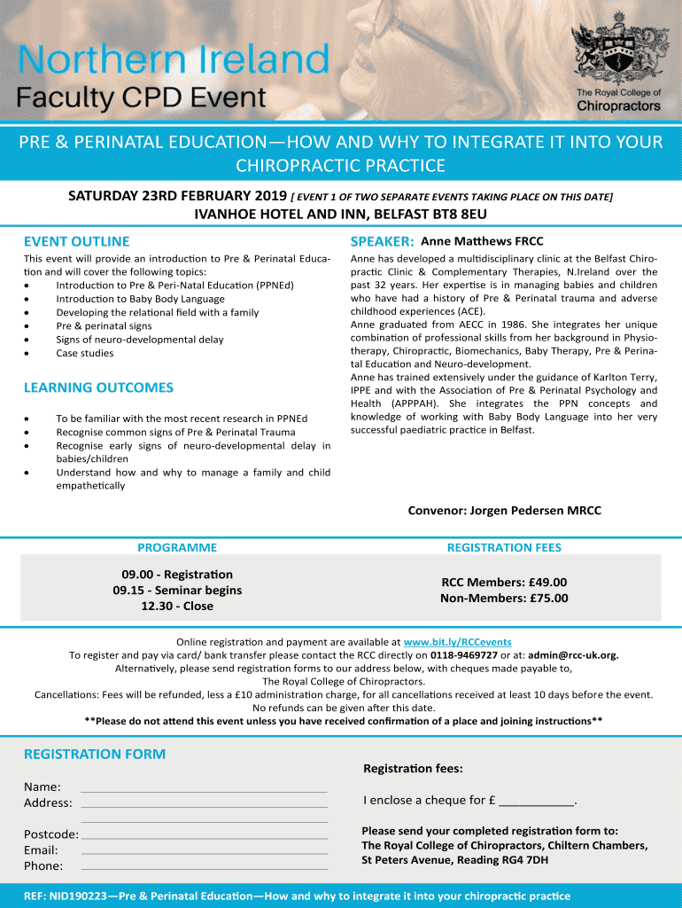 PRE & PERINATAL EDUCATION AND WHY TO INTEGRATE IT INTO YOUR CHIROPRACTIC PRACTICE SATURDAY 23RD FEBRUARY 2019 EVENT 1 OF TWO SEPARATE EVENTS TAKING PLACE ON THIS DATE IVANHOE HOTEL AND INN, BELFAST