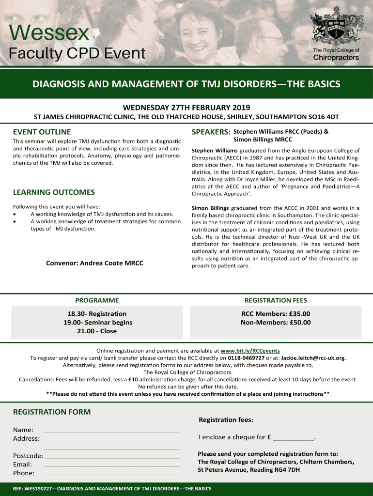 DIAGNOSIS AND MANAGEMENT OF TMJ DISORDERS BASICS WEDNESDAY 27TH FEBRUARY 2019 ST JAMES CHIROPRACTIC CLINIC, THE OLD THATCHED HOUSE, SHIRLEY, SOUTHAMPTON SO16 4DTEVENT OUTLINESPEAKERS:This seminar