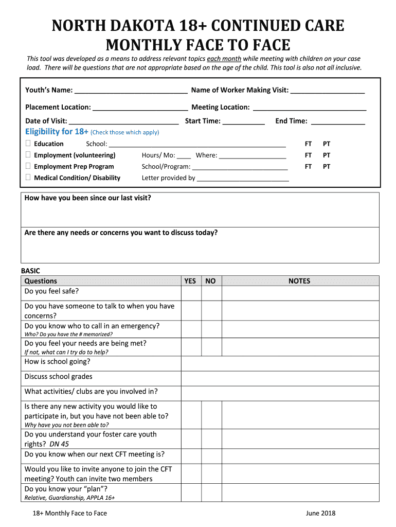 NORTH DAKOTA 18+ CONTINUED CARE MONTHLY FACE TO FACE This tool was developed as a means to address relevant topics each month while meeting with children on your case load. There will be questions