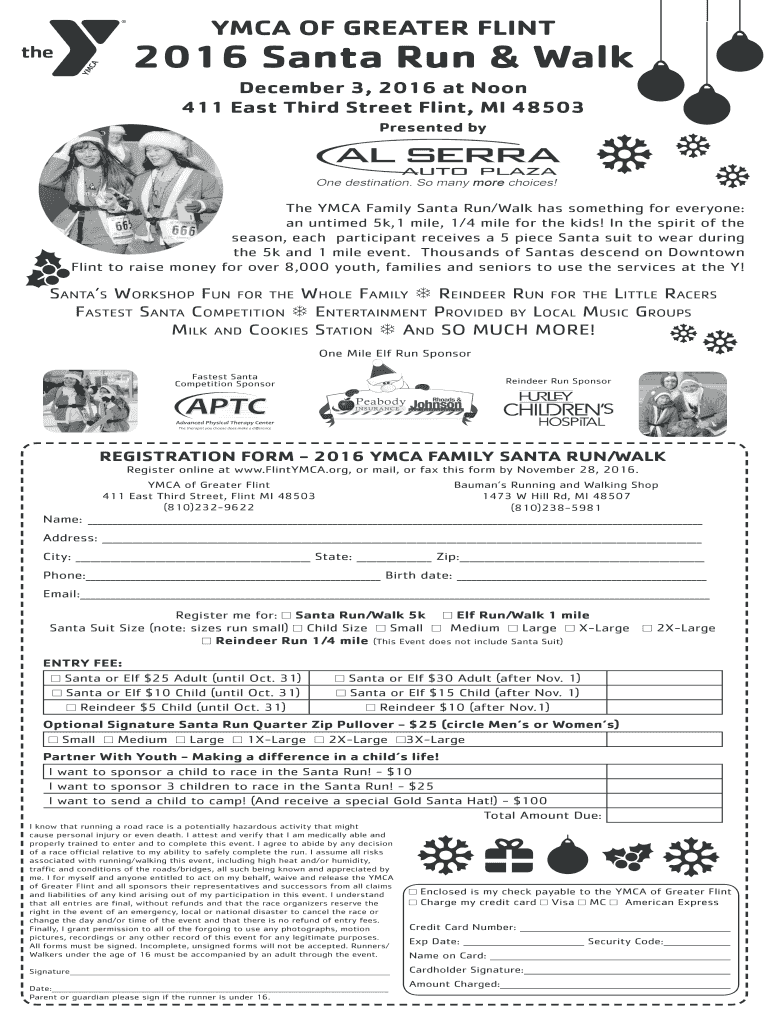 YMCA of Greater Flint2016 Santa Run & Walk December 3, 2016, at Noon 411 East Third Street Flint, MI 48503 Presented byte YMCA Family Santa Run/Walk has something for everyone: an untimed 5k,1 mile,