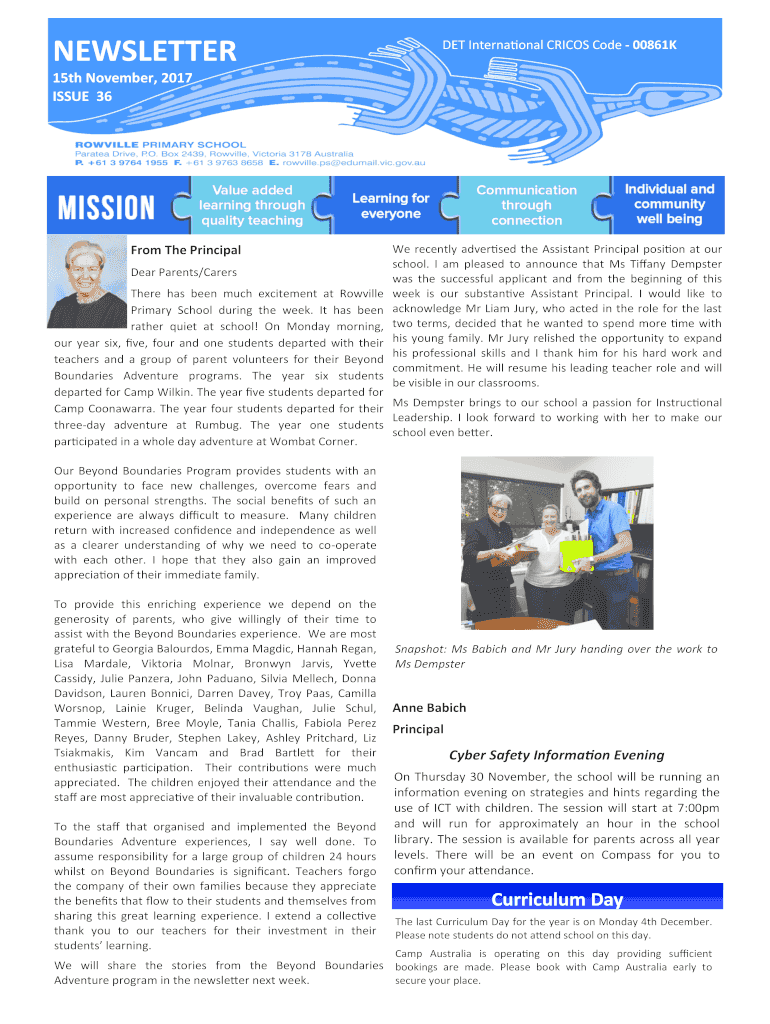 NEWSLETTER DET International CRICKS Code 00861K15th November 2017 ISSUE 36From The Principal Dear Parents/Carrie recently advertised the Assistant Principal position at our school. I am pleased to