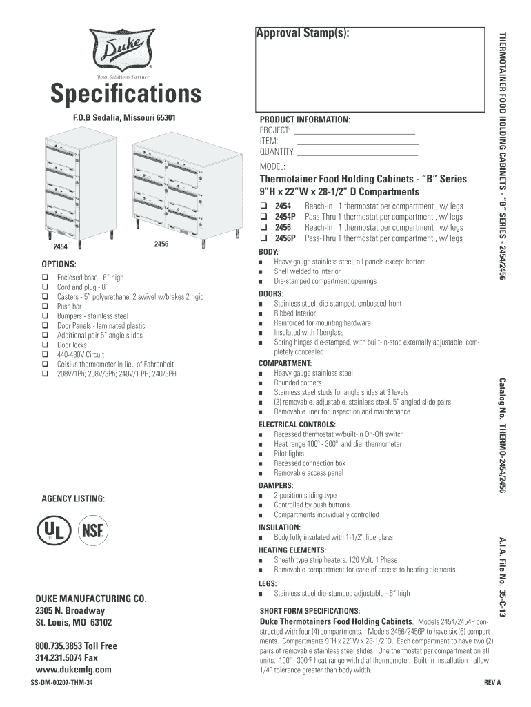 THERMOHALINE FOOD HOLDING CABINETS B SERIES 2454/2456Approval Stamp(s):Specifications F.O.B Somalia, Missouri 65301PRODUCT INFORMATION: PROJECT: ITEM: QUANTITY: MODEL:Thermohaline Food Holding Cabinets