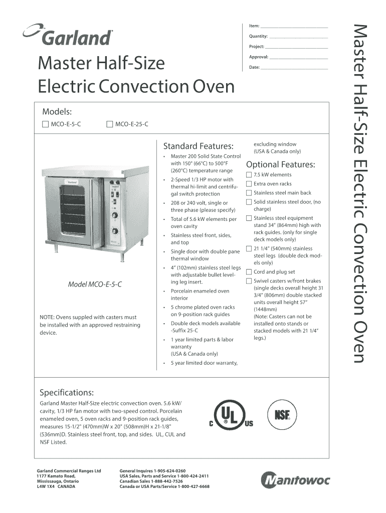 Quantity: Project: Master Halftime Electric Convection Pre-approval: Date: Models: MCOE5C MCOE25CStandard Features: Master 200 Solid State Control with 150 (66C) to 500F (260C) temperature range 2Speed