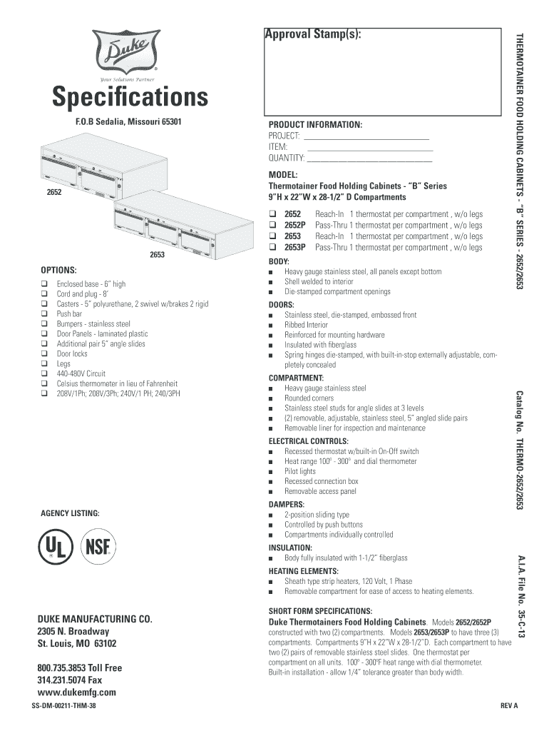 THERMOHALINE FOOD HOLDING CABINETS B SERIES 2652/2653Approval Stamp(s):Specifications F.O.B Somalia, Missouri 65301MODEL: Thermohaline Food Holding Cabinets B Series 9H × 22W × 281/2 D Compartments26522653OPTIONS: