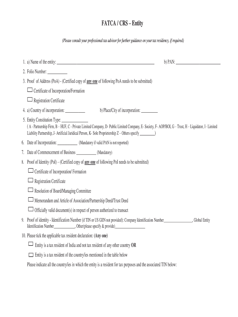 FATWA / CRS Entity (Please consult your professional tax advisor for further guidance on your tax residency, if required)1. a) Name of the entity: b) PAN: 2. Folio Number: 3. Proof of Address (POA)