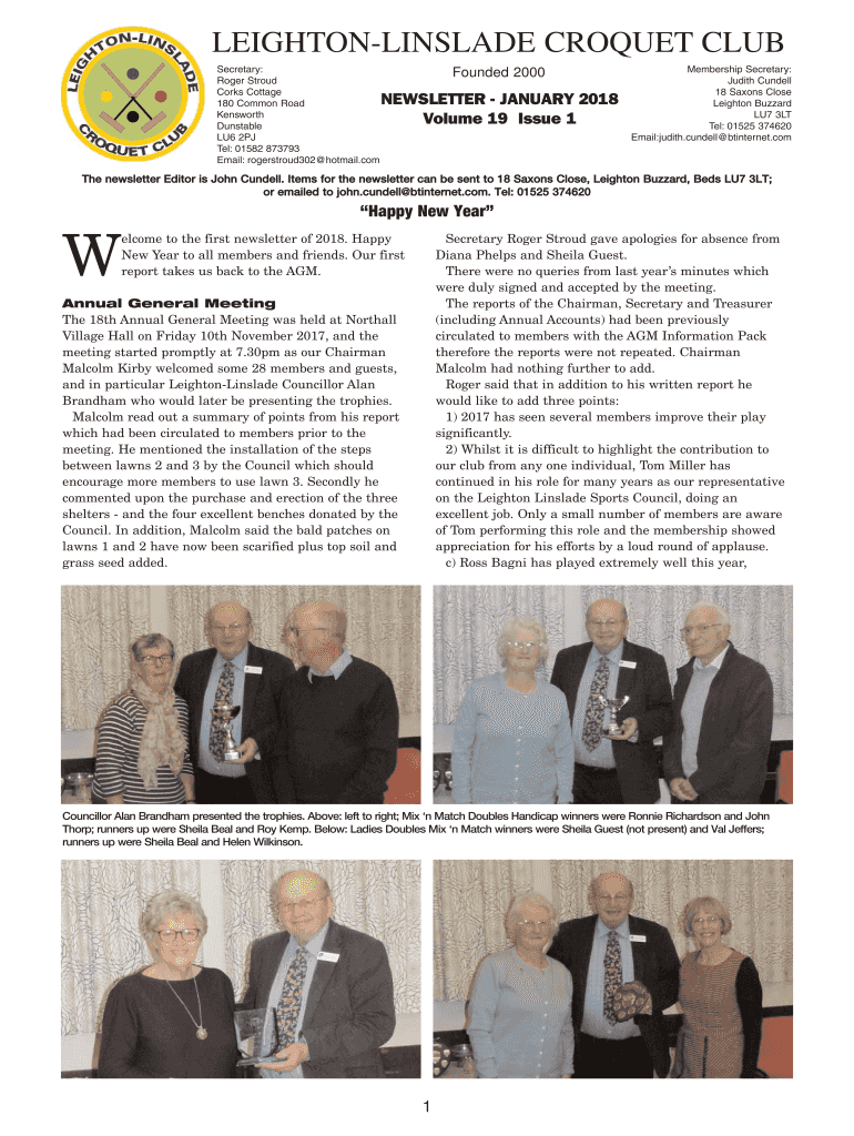 LEIGHTONLINSLADE CROQUET CLUB Secretary: Roger Shroud Corks Cottage 180 Common Road Kens worth Unstable LU6 2PJ Tel: 01582 873793 Email: rogerstroud302 Hotmail. Compounded 2000NEWSLETTER JANUARY 2018