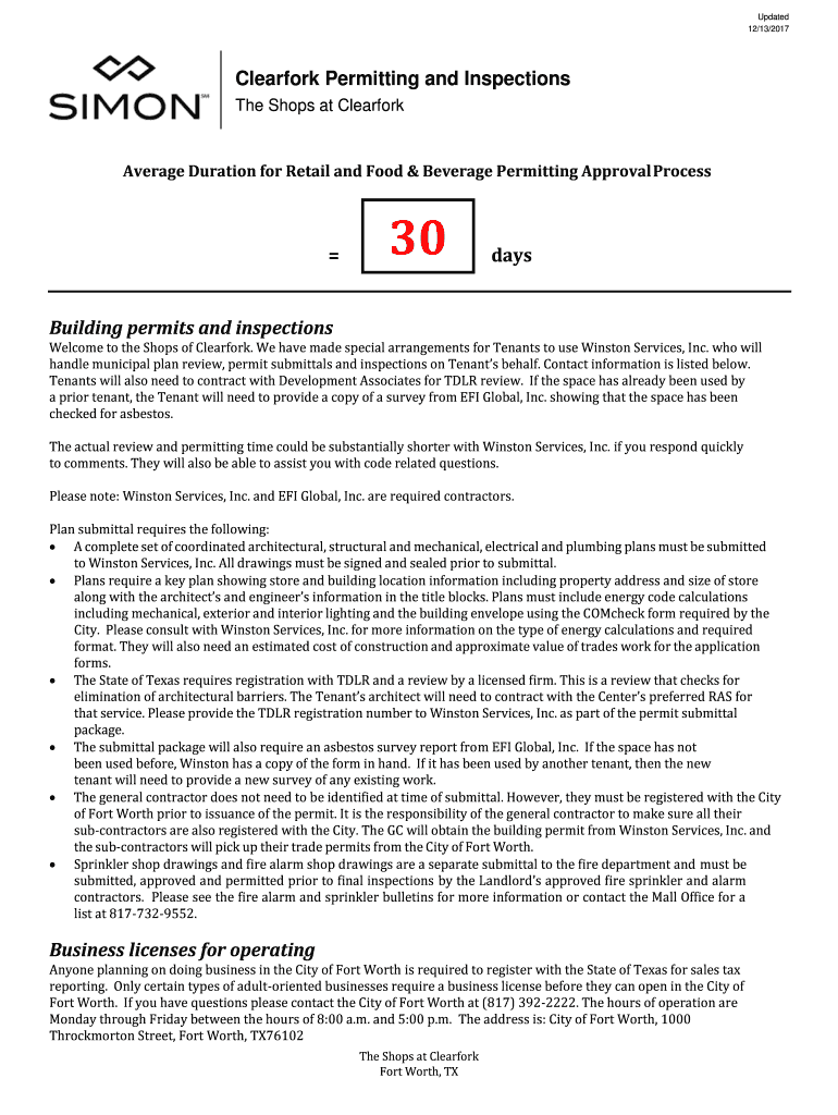 Updated 12/13/2017Clearfork Permitting and Inspections The Shops at ClearforkAverage Duration for Retail and Food & Beverage Permitting Approval Process30daysBuilding permits and inspections Welcome