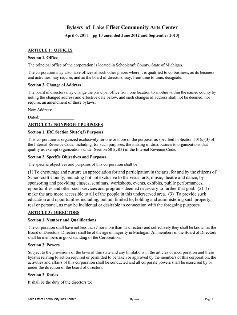 Get the free Bylaws of Lake Effect Community Arts Center