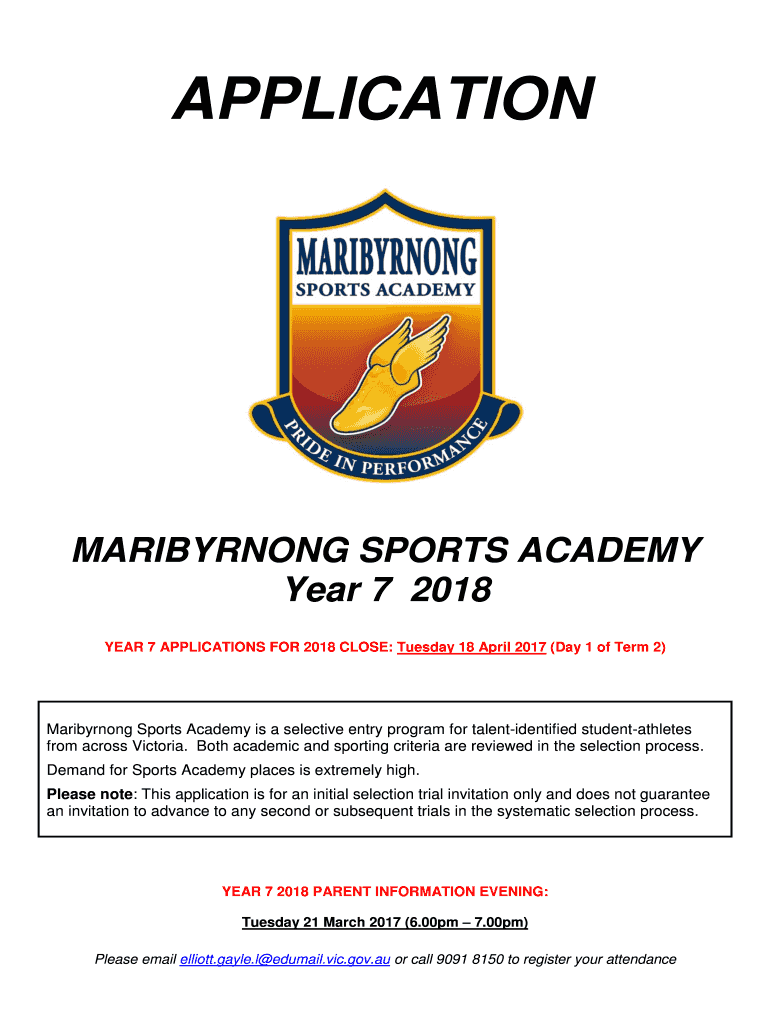 YEAR 7 APPLICATIONS FOR 2018 CLOSE: Tuesday 18 April 2017 (Day 1 of Term 2)Maribyrnong Sports Academy is a selective entry program for talent identified