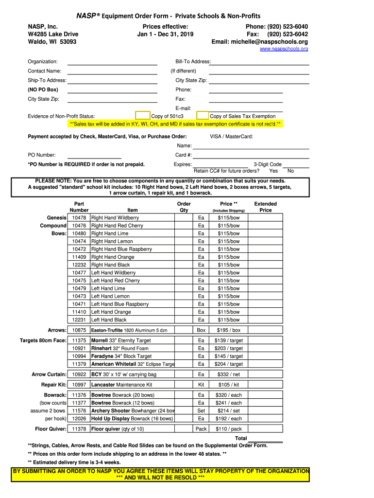 NASP Equipment Order Form is needed by schools, organizations, or individuals who wish to purchase equipment related to the National Archery in the Schools Program.
