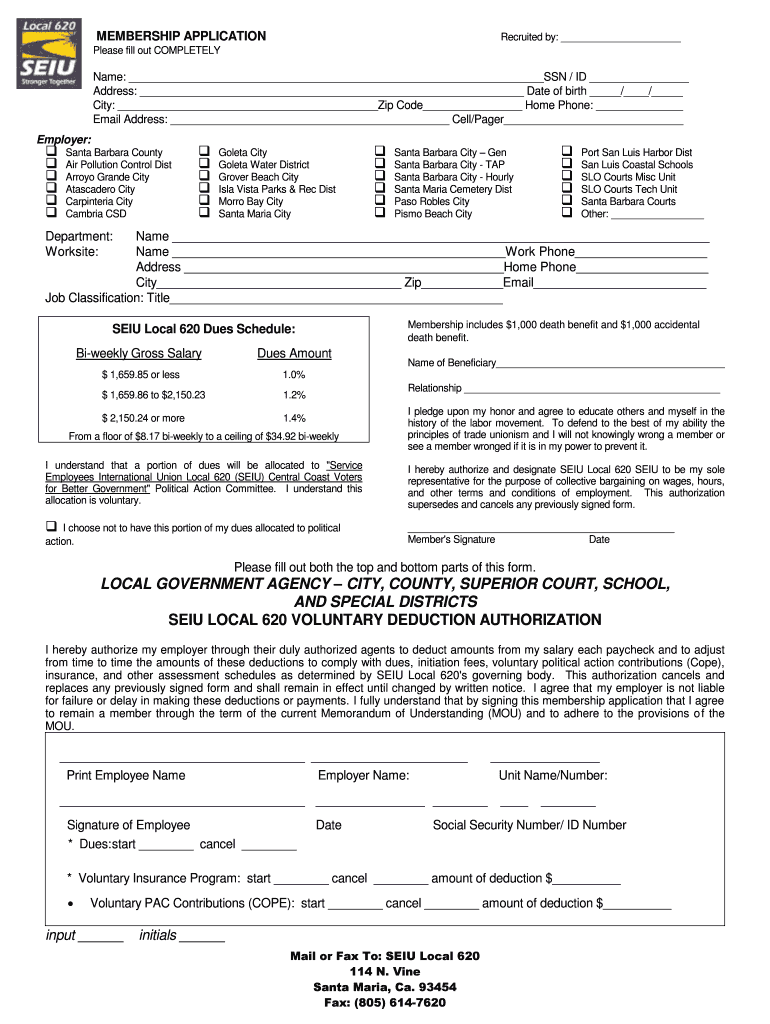 MEMBERSHIP APPLICATIONRecruited by: Please fill out COMPLETELYName: SSN / ID Address: Date of birth / / City: Zip Code Home Phone: Email Address: Cell/Pager Employer: Santa Barbara County Air Pollution