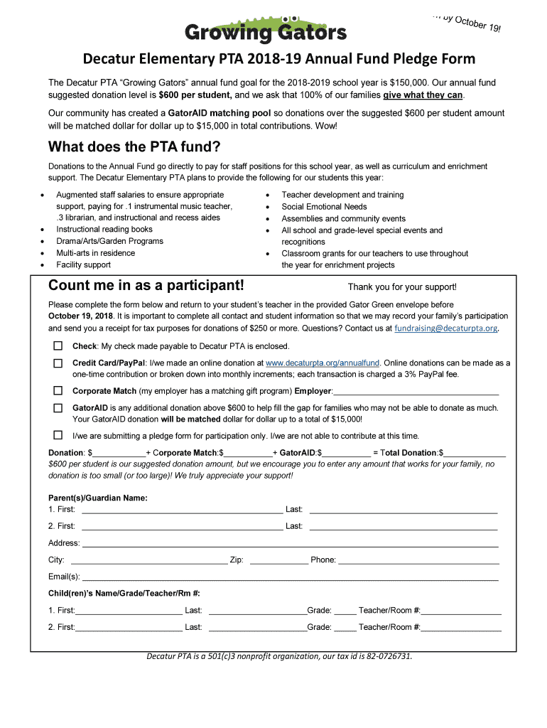 Decatur Elementary PTA 201819 Annual Fund Pledge Form