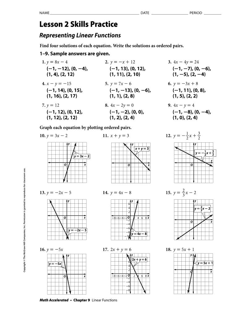 NAME DATE PERIOD Lesson 2 Skills Practice Representing Linear Functions Find four solutions of each equation. Write the solutions as ordered pairs.19. Sample answers are given. 1. y 8x 42. Y x + 12(1,
