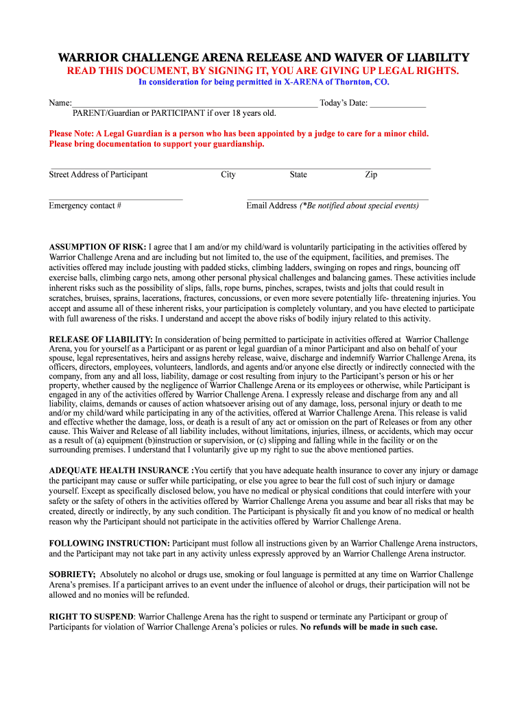 WARRIOR CHALLENGE ARENA RELEASE AND WAIVER OF LIABILITY READ THIS DOCUMENT, BY SIGNING IT, YOU ARE GIVING UP LEGAL RIGHTS. In consideration for being permitted in ARENA of Thornton, CO. Name: Today's