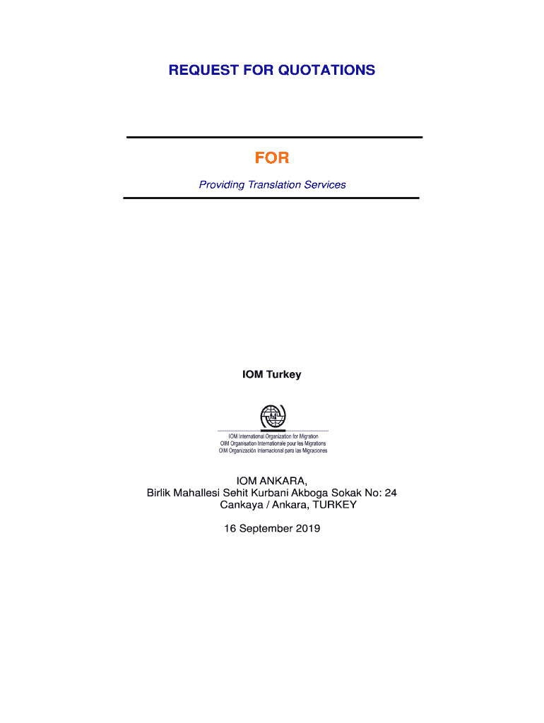 REQUEST FOR QUOTATIONS Providing Translation Services IOM Turkey IOM ANKARA, Berlin Manacles Shit Urban Boga Soak No: 24 Canada / Ankara, TURKEY 16 September 2019IOM Turkey Ankara Office REQUEST FOR