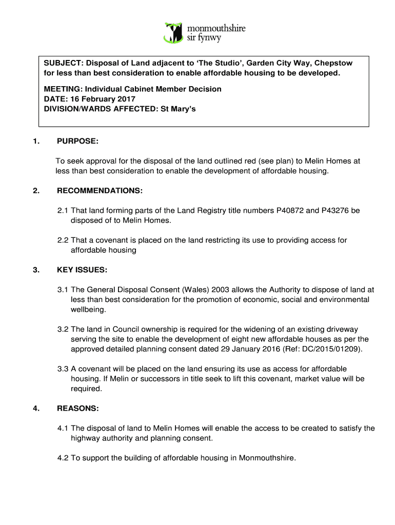 SUBJECT: Disposal of Land adjacent to The Studio, Garden City Way, Chest