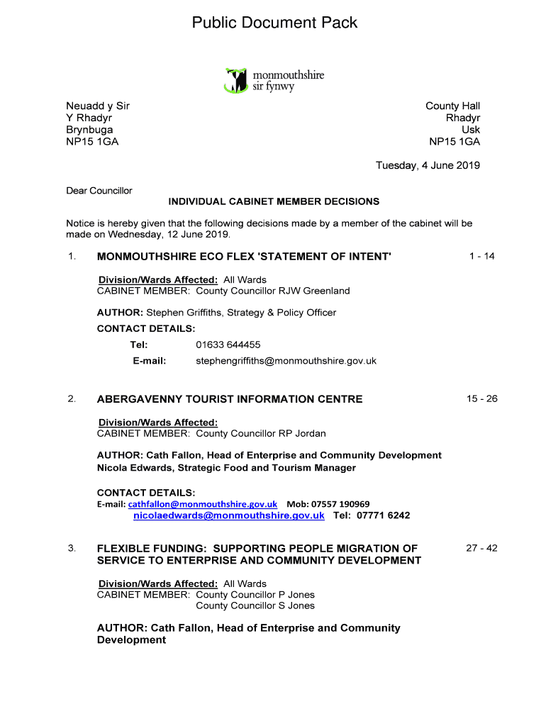 Public Document PackNeuadd y Sir Y Ready Brynbuga NP15 1GACounty Hall Ready Us NP15 1GA Tuesday, 4 June 2019Dear Councillor INDIVIDUAL CABINET MEMBER DECISIONS Notice is hereby given that the following