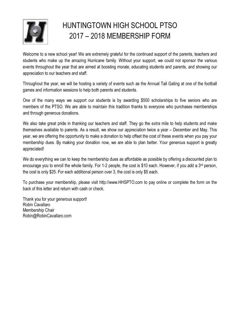 HUNTINGTON HIGH SCHOOL PESO 2017 2018 MEMBERSHIP FORM Welcome to a new school year! We are extremely grateful for the continued support of the parents, teachers and students who make up the amazing
