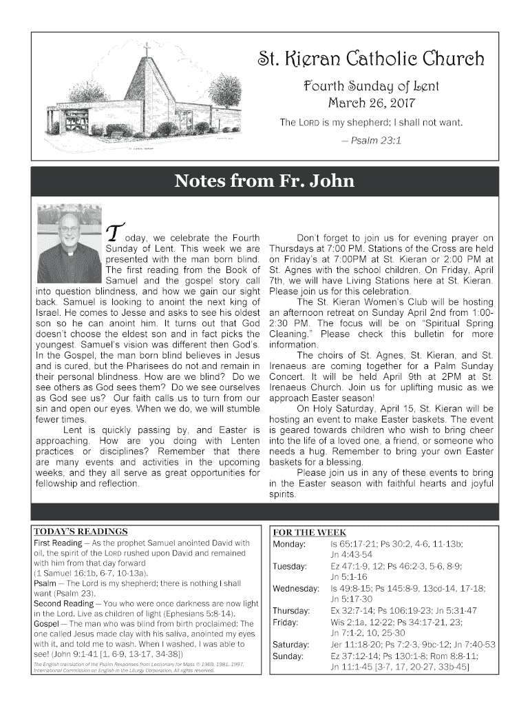 St. Kieran Catholic Church Fourth Sunday of Lent March 26, 2017, The LORD is my shepherd; I shall not want. Psalm 23:1Notes from Fr. John Today, we celebrate the Fourth Sunday of Lent. This week we