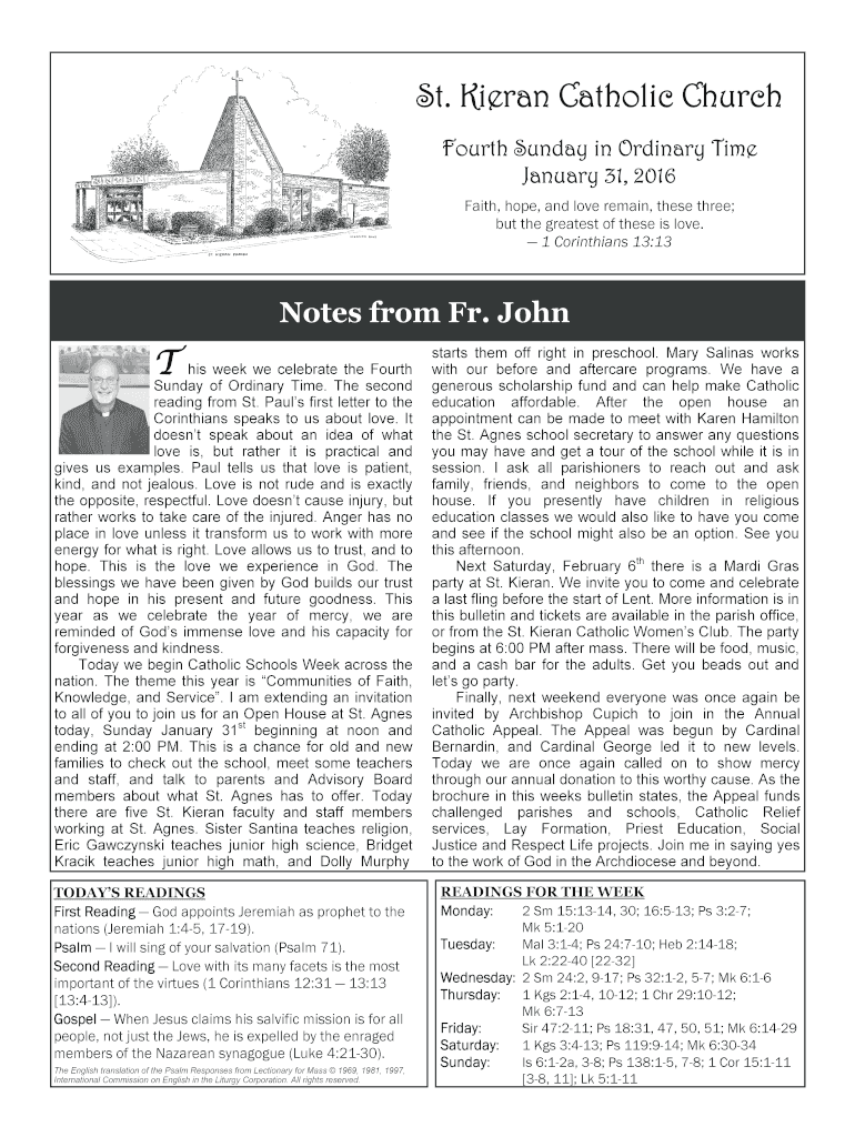 St. Kieran Catholic Church Fourth Sunday in Ordinary Time January 31, 2016, Faith, hope, and love to remain, these three; but the greatest of these is love. 1 Corinthians 13:13Notes from Fr. John