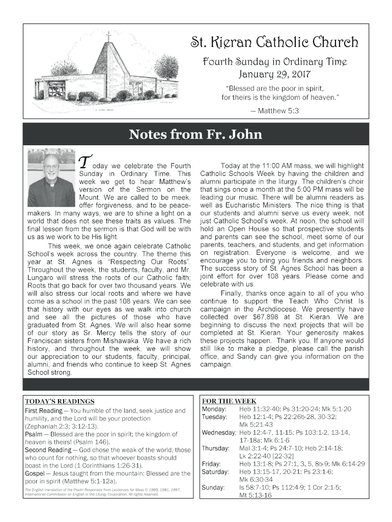 St. Kieran Catholic Church Fourth Sunday in Ordinary Time January 29, 2017, Blessed are the poor in spirit, for theirs is the kingdom of heaven. Matthew 5:3Notes from Fr. John Today we celebrate the